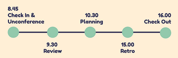 Bei NewVOSTRA haben wir zwei Projekttage (Mittwoch und Donnerstag). An diesen beiden Tagen arbeiten alle für das Projekt und es finden auch die meisten Besprechungen statt. Jeden zweiten Mittwoch ist zudem Sprintwechsel (= Abschluss einer zweiwöchigen Projektphase und Start einer neuen). Die folgende Grafik stellt exemplarisch einen solchen Sprintwechsel dar und zeigt auf, welche Zeremonien nacheinander stattfinden.