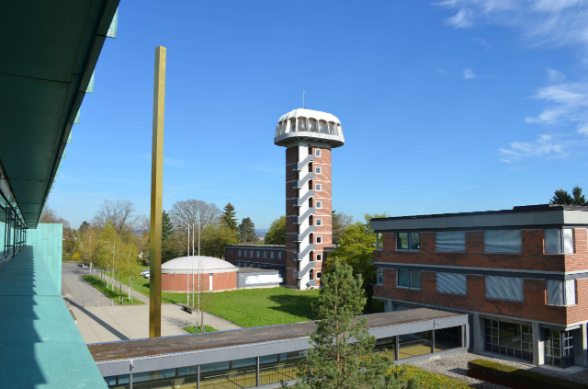 It is made of chrome steel and is gold-plated. Its surface gives it a distinctive signal effect. It is the work of the Aargau artist Max Matter (1941).
