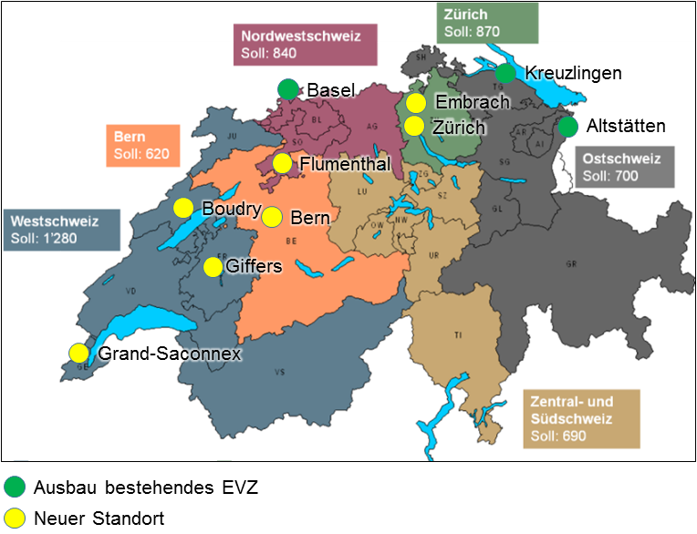 La planification des emplacements de ces centres est très avancée. De nombreux sites sont d’ores et déjà connus. La planification de la région Suisse orientale est achevée, alors que, pour les autres régions, il reste à examiner quelques variantes avant de prendre des décisions définitives.